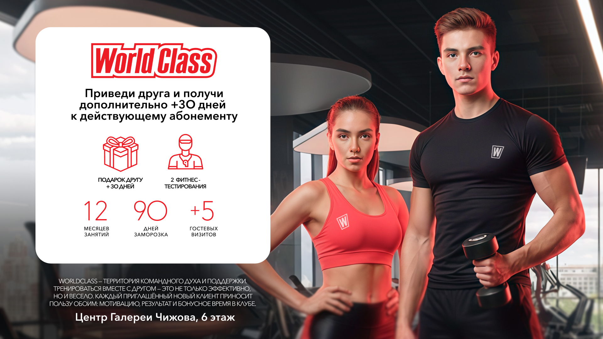 World Class - территория командного духа и поддержки. Тренироваться вместе с другом - это не только эффективно, но и весело. Каждый приглашённый новый клиент приносит пользу обоим: мотивацию, результат и бонусное время в клубе.